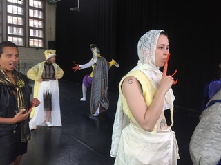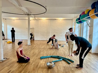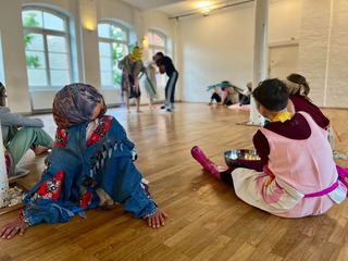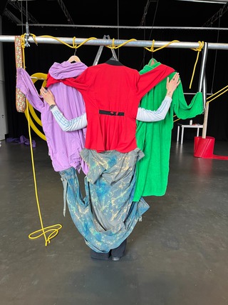 One of the main workshop formats I offer is the costume workshop, which focuses on the choreographic and sensory potential of garments and textiles. Clothes carry layered meanings—they protect, conceal, evoke memory, signal identity, and shape perception. On stage, they guide how we are seen and how we see. In the workshop, participants engage with textiles and garments in a tactile, playful, and open-ended way. We throw clothes onto our bodies and into space—and let them throw back possibilities for movement, character, and composition. Grounded in shifting mediums, this process becomes a space for both intuitive discovery and thoughtful reflection, asking how materials move us and shape our gestures, presence, and perception.