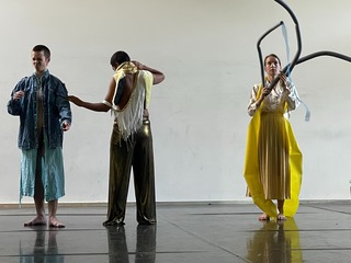 A bit about shifting mediums: shifting mediums is a choreographic approach I’ve developed through years of solo and ensemble work. It explores how rhythm and motion travel across different vessels—bodies, voices, objects, costumes, and space—blurring boundaries between human and non-human, initiator and receiver, body and material. The method is rooted in rhythm-based patterns that shift fluidly across performers and materials, creating a state of heightened awareness and interdependence. Movements don’t “belong” to a single body—they travel intuitively, forming a network of exchange. This practice cultivates a form of shared presence and choreography-as-coexistence: a way to rehearse how we share time, space, and attention.