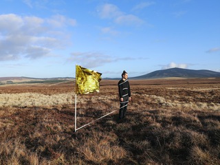 Set within the Scottish Highlands, the series places the artist in dialogue with two symbolic objects: a long piece of cloth, representing the shifting and often arbitrary notion of the border, and an emergency blanket, hoisted like a flag to evoke both nationhood and collective identity.